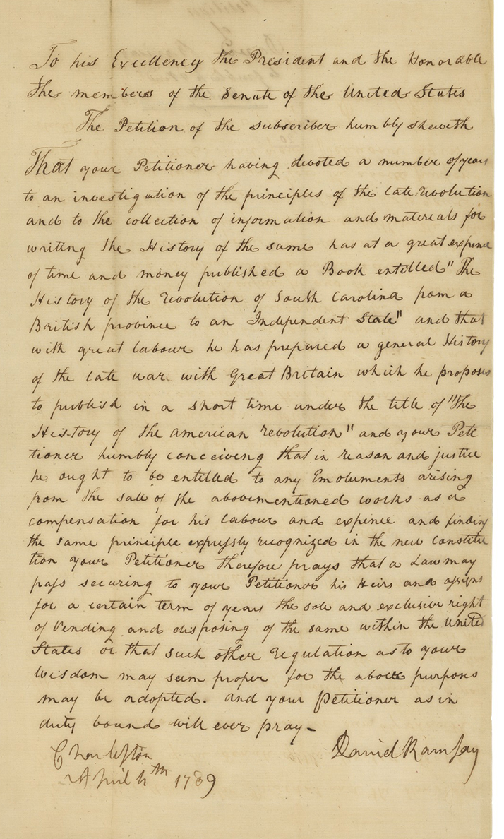 Dr. David Ramsay filed a petition with the House of Representatives asking Congress to pass a law to grant him the exclusive right of “vending and disposing” of his books within the United States. The Congressional committee approved his petition on April 20, 1789 – the first private citizen granted a copyright.