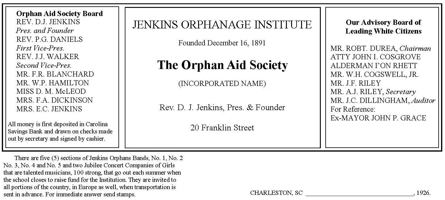 The above Jenkins letterhead, 1923, reflected the Jim Crow attitude of the time. The implied racist message of the letterhead is: The Jenkins Orphanage was run by a black man, but there were responsible white citizens monitoring the Orphan Aid Society, assuring donations were used properly. Even after thirty years of success, Rev. Jenkins was still not fully trusted by the white citizens of Charleston.